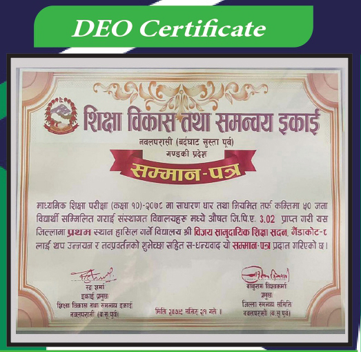 Ever since its establishment in 2058 B.S. (2001 A.D.) with a slogan “Our Children, Our Future”. Vijaya Samudayik Siksha Sadan (VSSS) has secured a recognized place among the reputed schools of Nepal. Vijaya Samudayik Siksha Sadan (VSSS) is a secondary school. It runs Grade XI and XII in the streams of Science & Management under the National Examination Board (NEB). The school follows the student-centered teaching methodology. As per the concept of Vijaya Community Education Co-operative Ltd. (VICEC), VSSS is moving ahead achieving many hallmarks of quality education. Simultaneously, it is gaining a remarkable reputation and applause from all academic sectors of the society. It is genuinely, as the name suggests, a community school, a school run by a number of people in a community. Structurally, based on co-operative principles, the school is making its way for a public approach to quality education standing in the position of a service giving institution rather than a profit making one.
